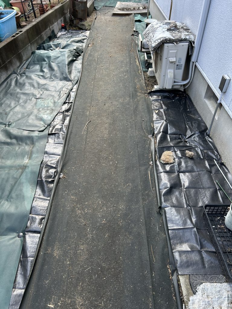 2. 高品質な防草シート施工 丁寧に下地を整え、隙間なく防草シートを敷き詰めることで、数年先までお手入れが不要な「楽なお庭」を作ります。
